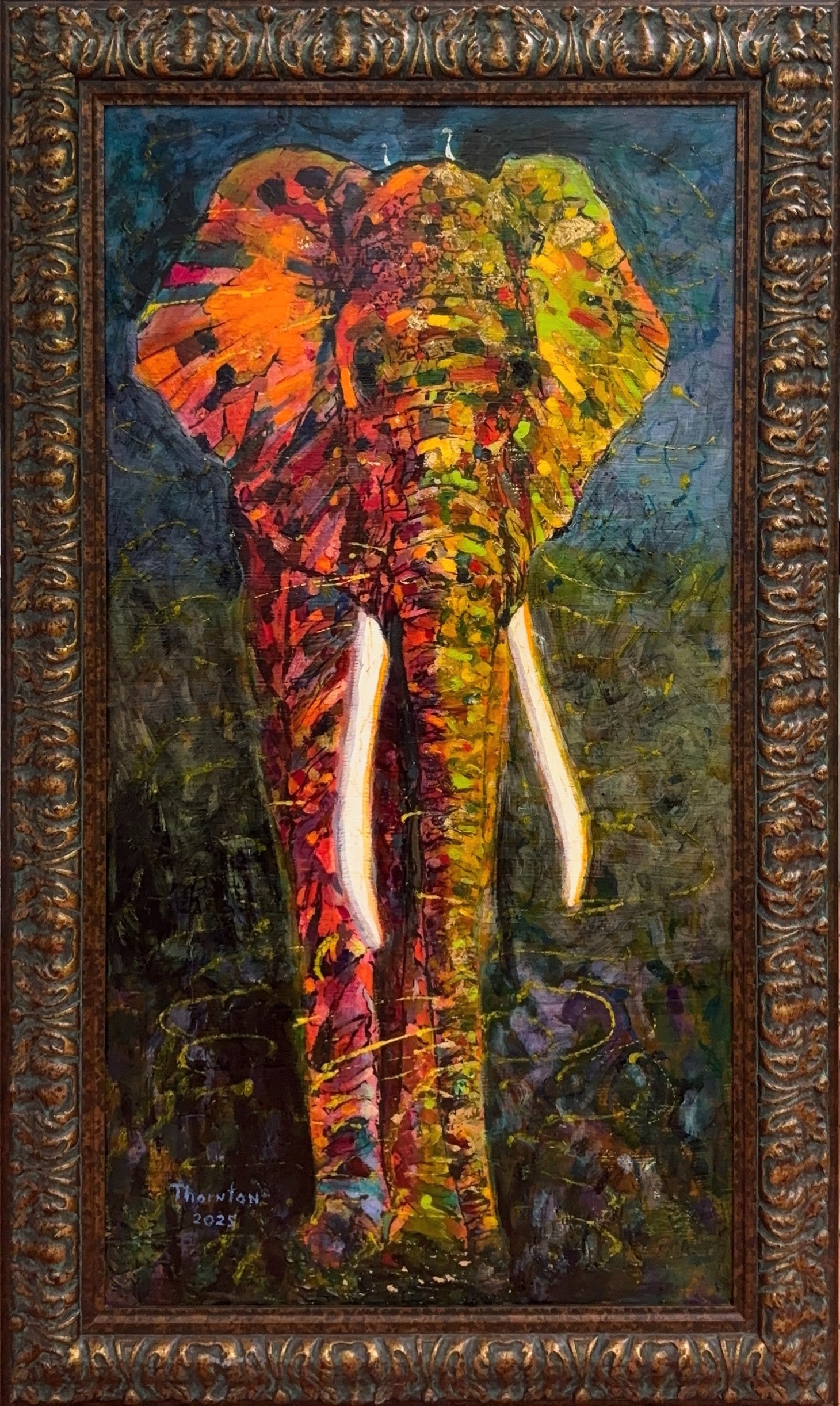 Inspired by Joel Thornton’s wife and her lifelong love of elephants, this work captures the animal’s strength, wisdom, and quiet presence. With bold layers of crimson, gold, and green, Elephant Spirit moves beyond likeness to reflect the spirit of one of nature’s most revered beings.