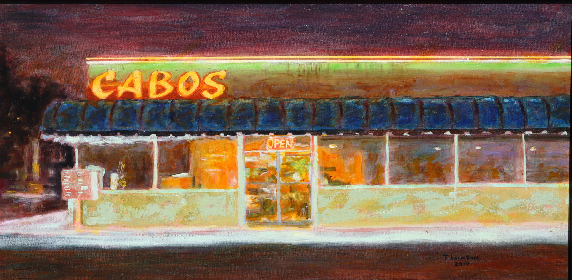 Rich oil layers pulse with the warmth of a Tallahassee night neon orange bleeds into deep burgundy skies, the glowing storefront cutting through the darkness with an intimacy only regulars knew. Loose, confident brushwork captures the flicker of that OPEN sign and the golden light within, a place where Tallahassee showed up, sat down, and stayed a while.